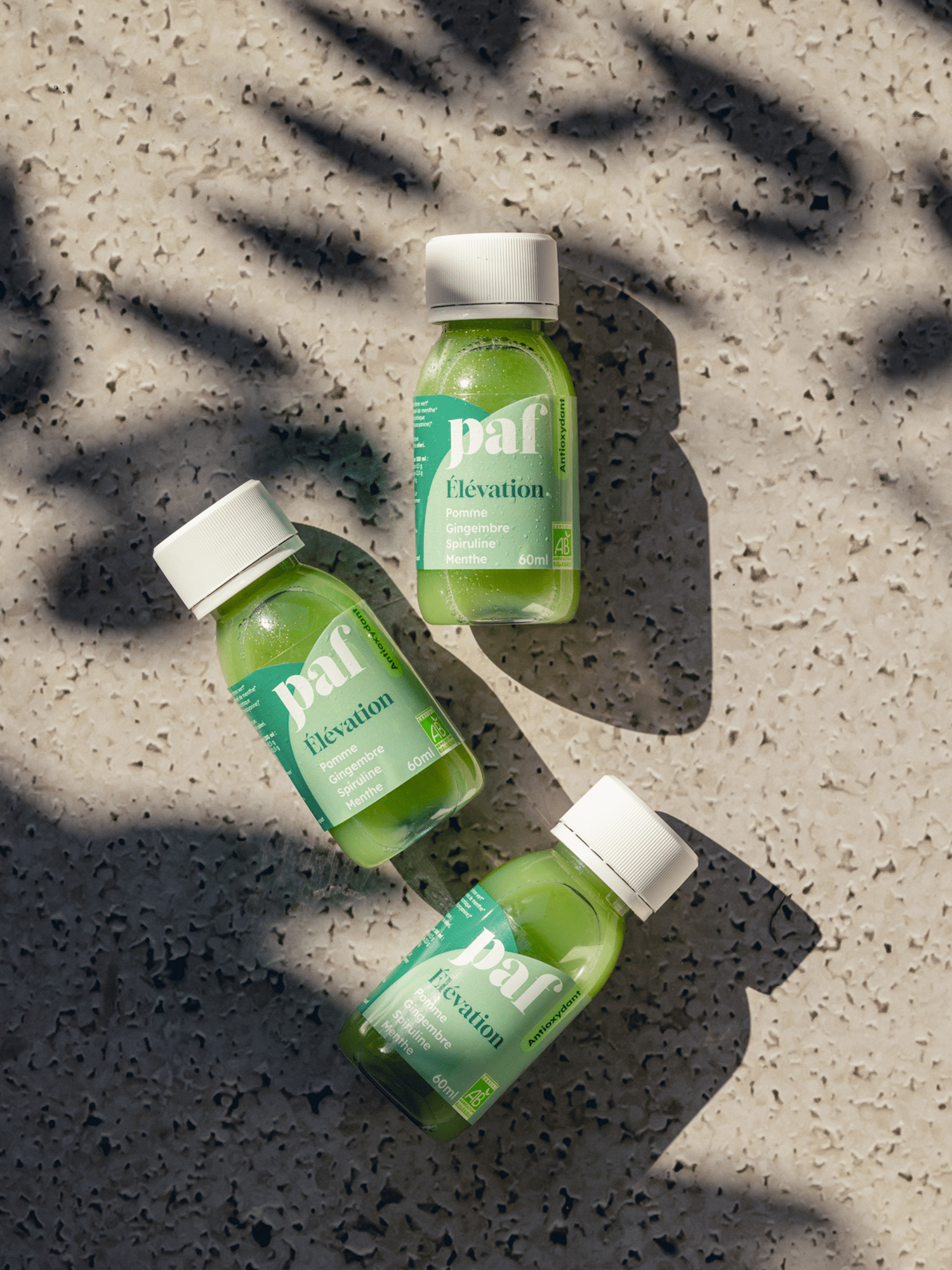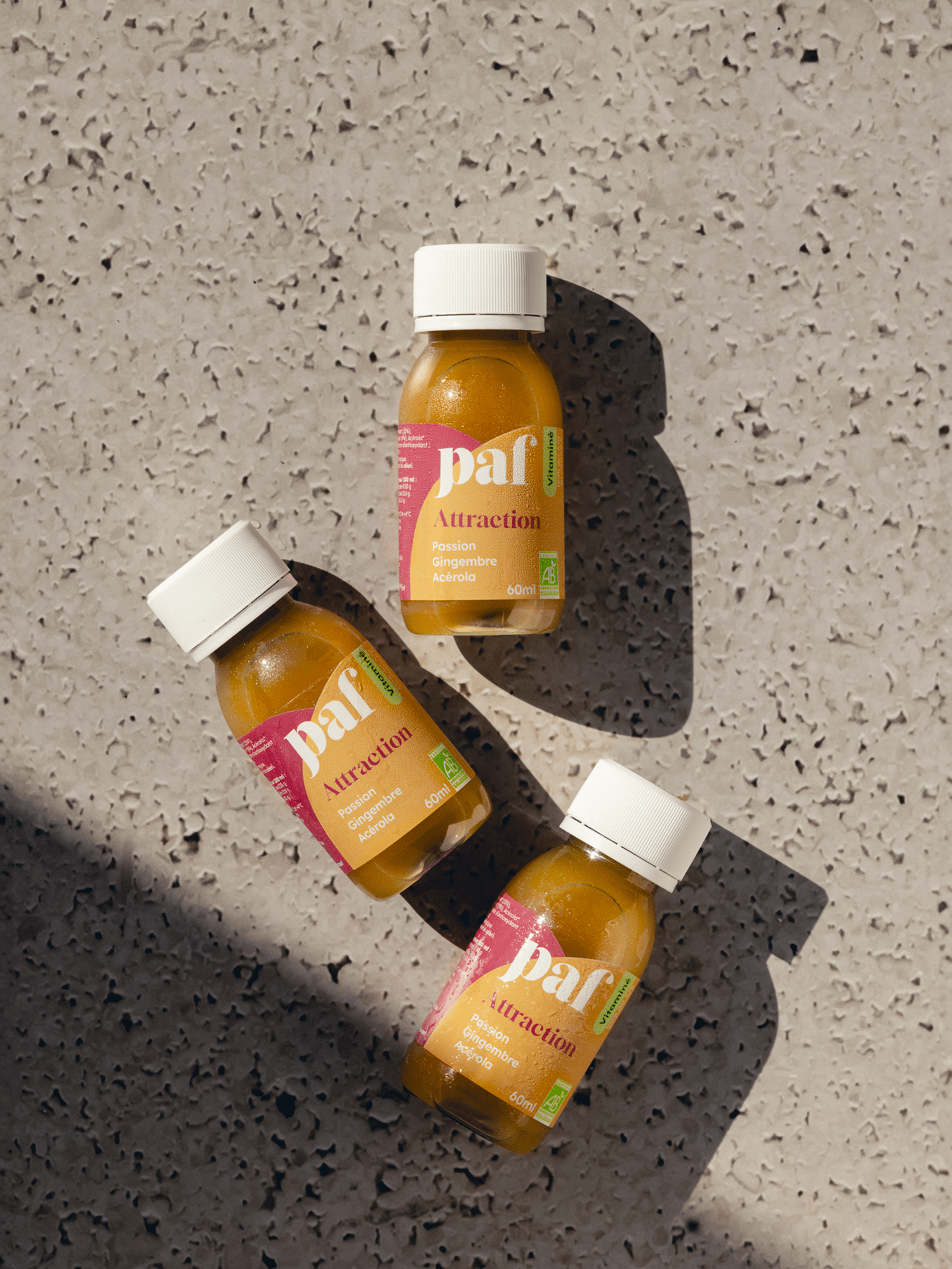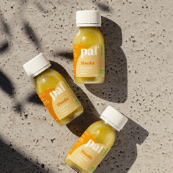 Chez PAF les matières premières sont 100% bio et rigoureusement sélectionnées afin de vous offrir un jus frais comme à la maison, la praticité et l’expertise en plus. Chaque bouteille de 240 ml contient environ 500g de fruits et légumes bio pressés (près d’un demi kilo !), soit l’équivalent de 6 portions, alors que l’OMS nous recommande d’en consommer au moins 5 par jour. Avec un jus PAF vous couvrez l’ensemble des apports nutritionnels dont votre corps a besoin dans une journée.
